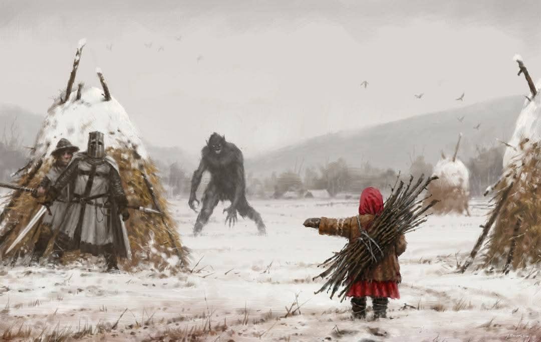 Картина: Воздаяние. Деревенская девочка указывает вервольфу на спрятавшихся за стогом сена крестоносцев, которые за несколько дней до этого сожгли как ведьму её маму.